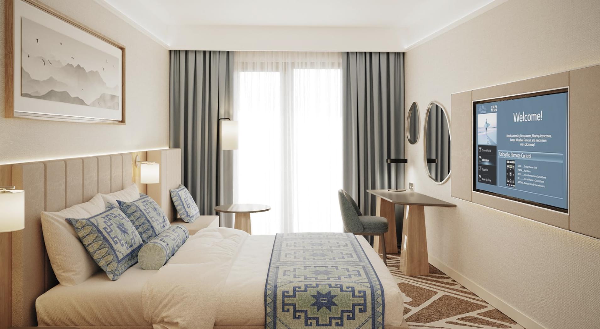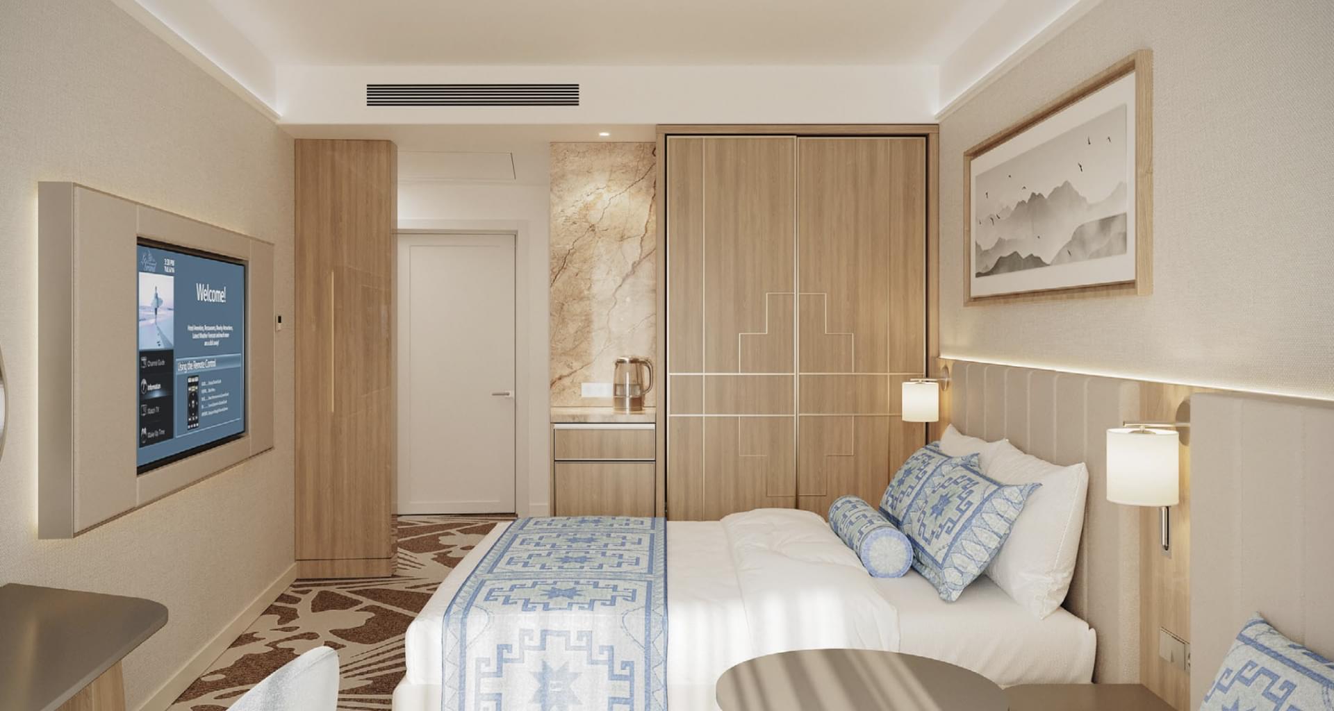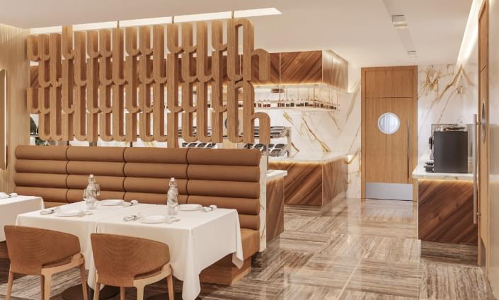 Отличительные элементы концепции теплые, светлые кофейные оттенки в сочетании с «морскими» мотивами на ковре.